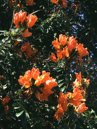 A handsome tree with spectacular 7 to 13 cm long flowers: the Flame Of The Forrest. Since it does flower more or less all year long, people took it with them from Africa around the Tropics and any place it can bear. As far as I know, it didn't become a problem yet.This one was photographed in the Capricorn Resort. |